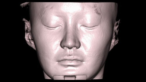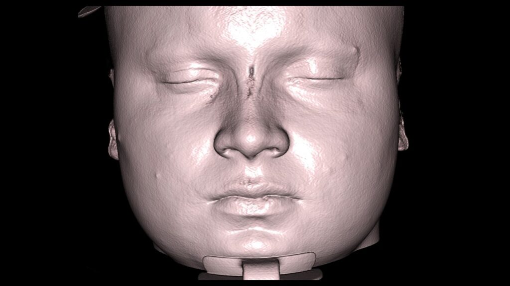 To get a clearer picture, let’s adjust the transparency of the CT scans. This allows us to see the relationship between the thickness of the soft tissue and the actual shape of the facial bones.