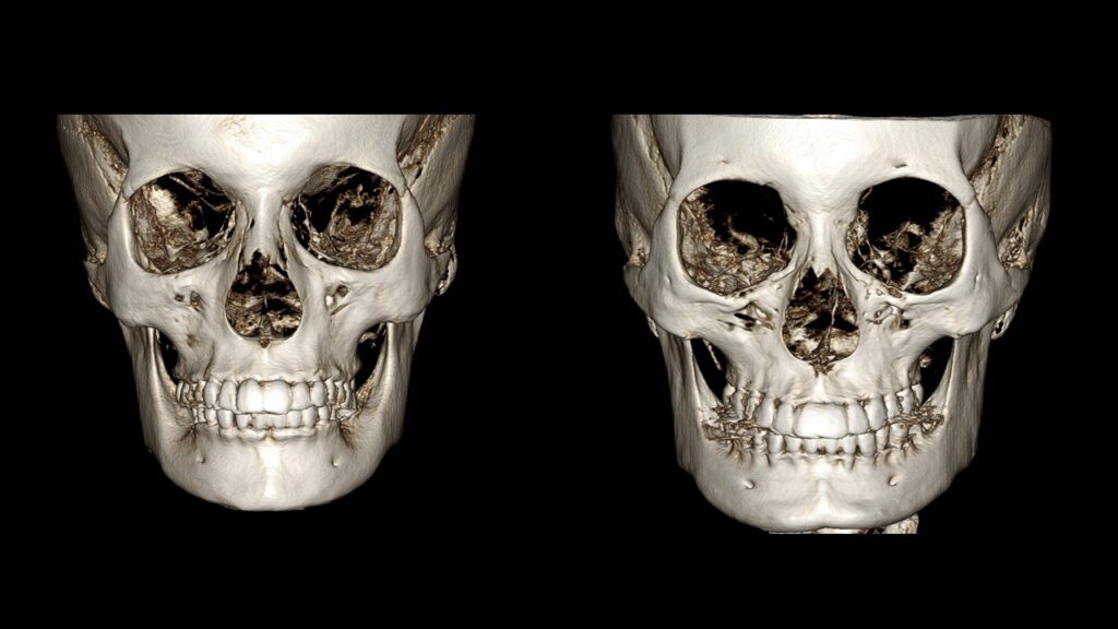 Below are 3D reconstructed images from actual patient CT scans. Between these two individuals, who do you think will see a more significant improvement after Facial Bone Contouring Surgery?
